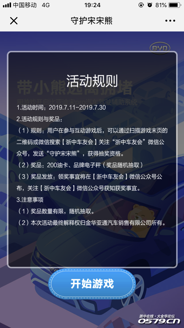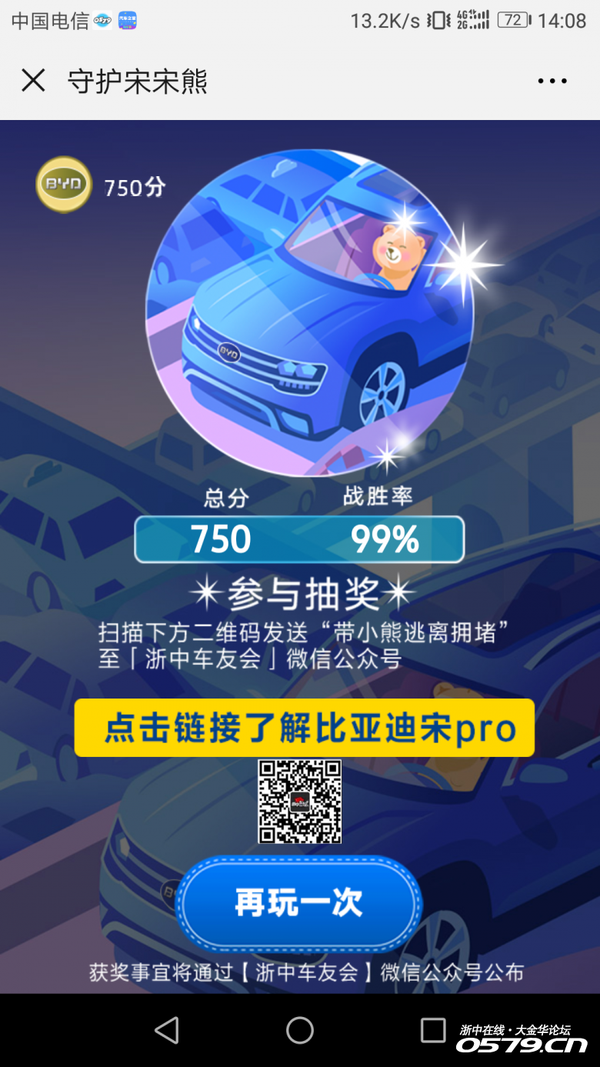 1.用户在参与互动游戏后,可以通过扫描游戏末页的二维码或微信搜索【浙中车友会】关注“浙中车友会”微信公众号,发送“守护宋宋熊”或“带小熊逃离拥堵”,获得抽奖资格。
