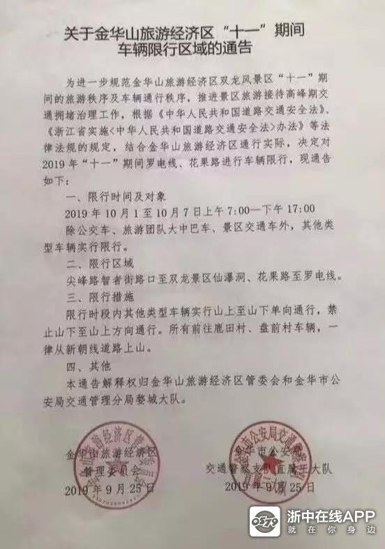 【金华山】关于金华山旅游经济区双龙风景区“十一”期间车辆限行区域的通告