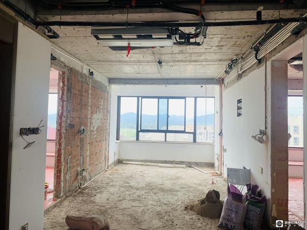 不喜欢客厅地砖的波导线和背景墙,又想实现无主灯,于是决定对客厅进行大改造。拆除了客厅地砖、吊顶、背景墙。