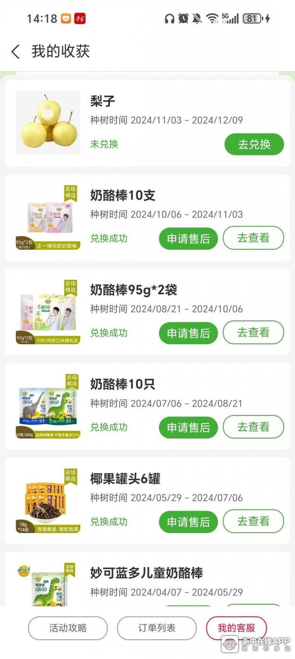支付宝芭芭农场种水果。最近几期都是换奶酪棒,孩子喜欢吃。但是好像没有了,不知道什么时候上架,其他不怎么合适。里面还有个集阳光,3000可以换一次,东西以小零食为主。