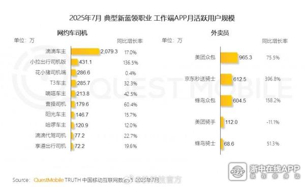 QuestMobile数据显示,截止到2025年7月,网约车司机月活跃用户规模达到2924.3万,同比增长23.3%。其中,滴滴车主月活跃用户规模2079.3万,同比增长17%。另一边,快递外卖行业同样蓬勃发展,从业人员规模也达到了约2000万。其中,外卖员1403.5万,快递员539.4万。