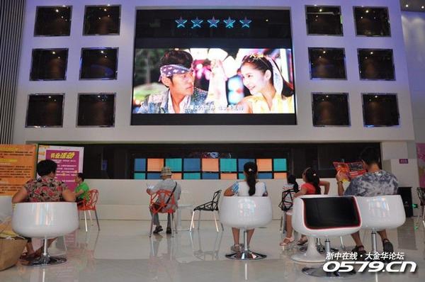在顾客等候区设有LED屏幕,轮流播放当前热映影片的预告片,你瞧大家看的多认真~