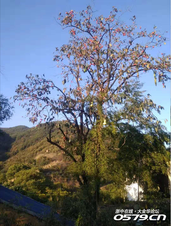 我也被眼前的美景闪了一下眼有点晕,但故作镇定,装出一副见过世面的波澜不惊,双手插在裤袋信步来到了后院的一颗柿子树下,看到上面如一个个小灯笼挂在树梢的红柿子,思绪飞回了儿时的岁月。那会儿村子里的那几颗果树,可是我们解馋的宝树啊!谁家的柚子何种口味、那颗鸡爪梨什么时候成熟,每个人都如数家珍。眼前这树上的几个葫芦点缀其中,不正如当年我们这些往上爬的小屁孩吗?