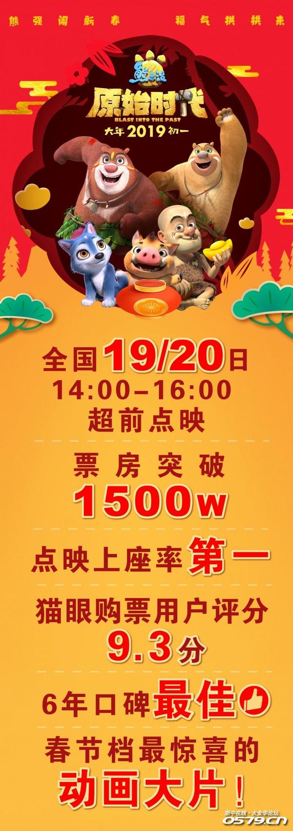 《熊出没》第六部大电影《熊出没·原始时代》将于2019年2月5日大年初一2D、3D同步上映,为让观众提前感受过年气氛,电影在2019年1月19日、20日14:00-16:00开启全国点映场。本次《熊出没·原始时代》点映场总票房突破1500万,上座率及票房第二天均逆跌上涨,两天均居于同时段第一;猫眼评分9.3创历代最高,并收获各大平台“好看、十分、制作精益求精、‘大片’感强、惊喜不断,《熊出没》系列最欢乐”的高度评价。