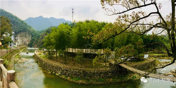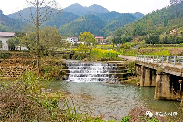 塔石乡文头村的小溪对面种植了一排排桃树