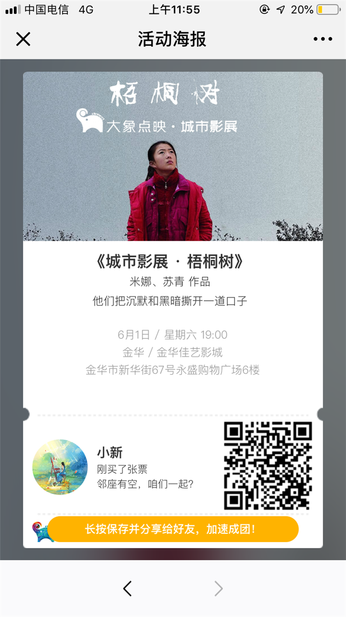 《梧桐树》在“一幕之遥”纪录片影展的展映档期为6月1日19:00,金华佳艺影城。