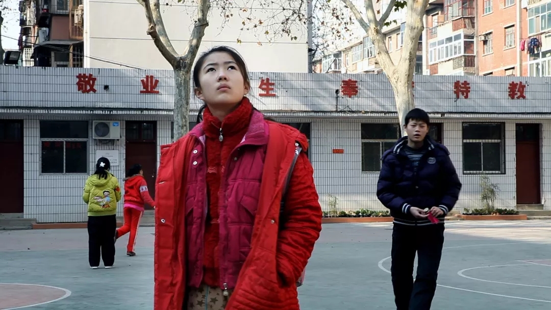 海报中望向天空的红衣少女,是美丽的曹寒子。《梧桐树》陪伴她从12岁花季至今。她自幼视听双重障碍。在聋班学习,她无法看清手语;在盲班,她听不清别人说话。