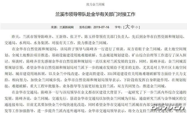 在金华市交通局,陈峰齐一行与该局领导在金义都市区建设大背景下,一起研究了下一步兰溪内外综合交通的发展。陈峰齐说,金兰同城,交通先行,恳请金华市交通局以加快金兰同城为目标,通盘研究兰溪与金华城区的交通连接布局,目前尤其要加快金兰中线快速化改造,同时希望金华市交通局对兰溪城市内部交通网络优化、港航开发等工作加强指导,进一步提升兰溪内连外通环境。金华市交通局领导表示,将全力支持兰溪的交通发展,特别是在金兰中线快速化改造、金建高铁建设、高速公路体系优化,以及交通规划、项目设计、要素难题破解等方面大力支持兰溪,优化兰溪交通环境。