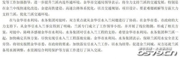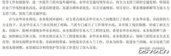 在与金华市水利局、水务集团对接时,双方重点就从金华引水入兰问题进行了协商。在金华市委、市政府的大力支持下,从金华引水入兰事宜得到了明确,兰溪专门成立了工作领导小组,并开展了线位勘测,形成了相关方案。对接中,陈峰齐感谢金华市水利局、水务集团对引水入兰工程的支持,希望金华市水利局、水务集团和兰溪一起,加快确定具体方案,尽快实现引水入兰工程落地实施。金华市水利局、水务集团表示,保障兰溪用水安全责无旁贷,将切实按照金华市委、市政府的要求,加快落实引水入兰工作,以水为纽带,促进金兰同城。双方还就兰溪备用水源调整、水资源综合利用保护等方面工作进行了深入交流。