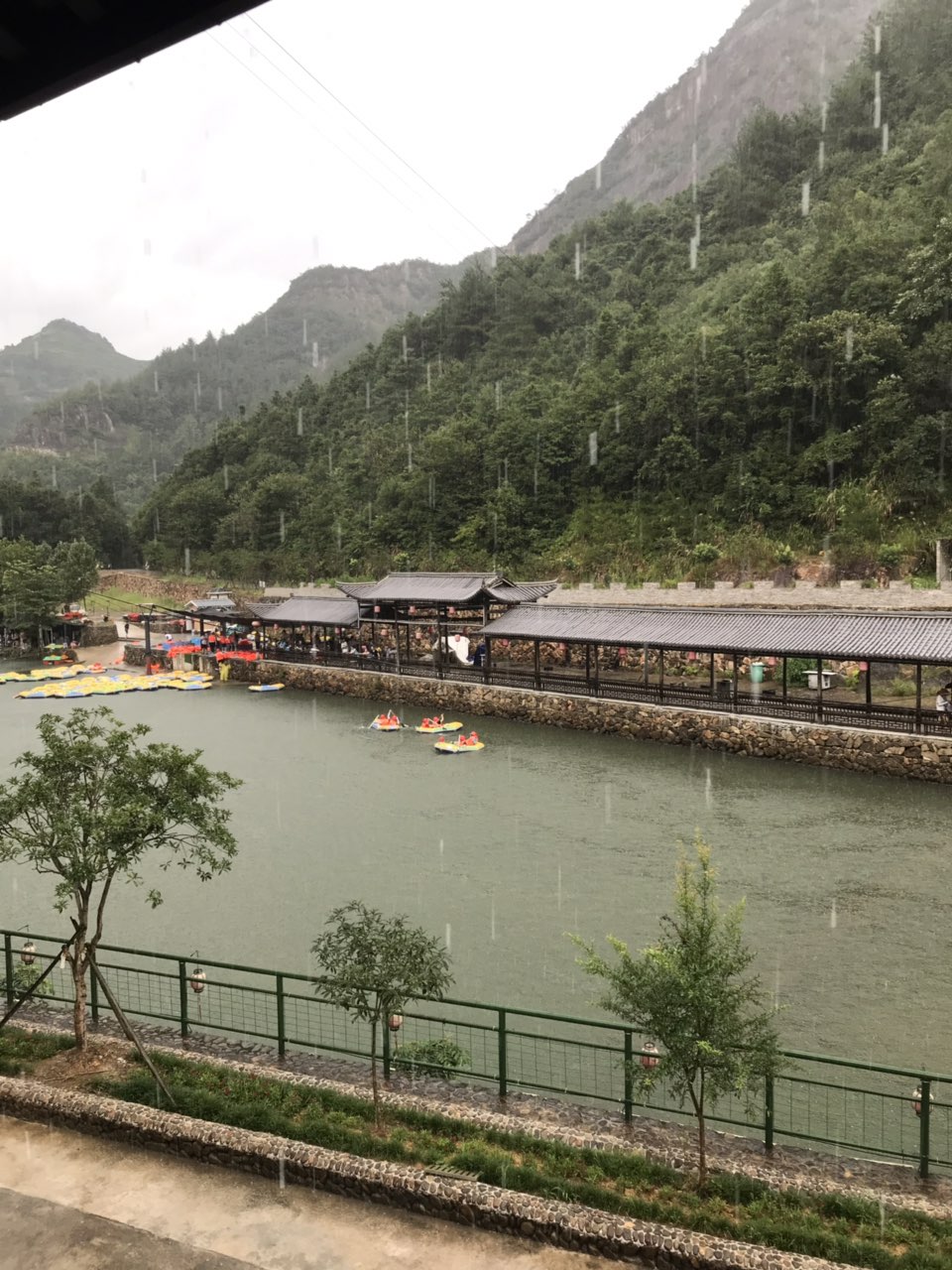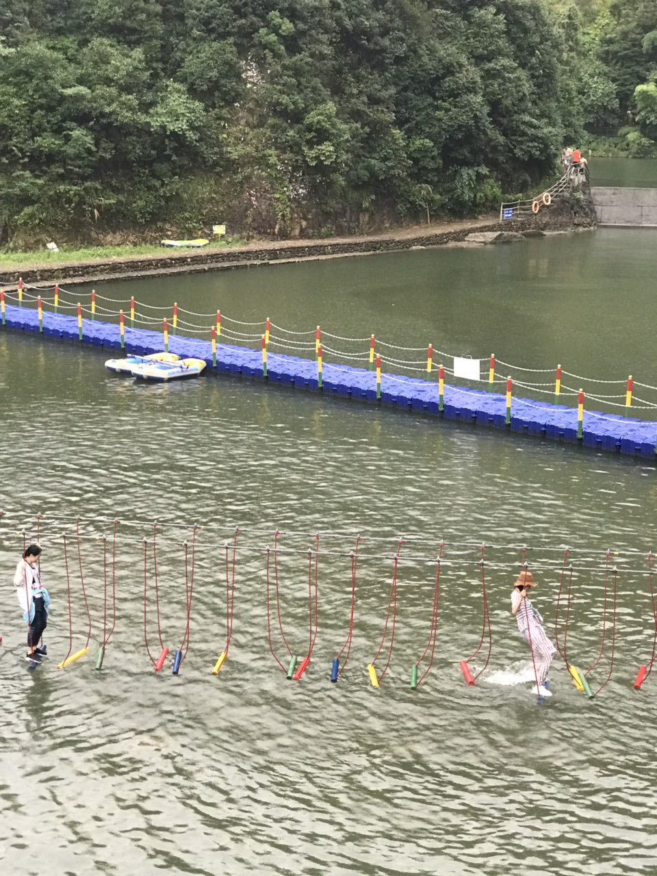 差不多10几分钟漂流结束,可以在水面上嬉戏。上岸后,可以去边上的水上乐园游玩,由于天气原因,突然下大雨,在长廊内躲雨了。