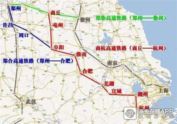 金华往中原方向现已拥有两条高铁通道,一条是经杭州、南京、徐州、商丘,以沪昆、宁杭、郑徐高铁为主干的东面通道,另一条是经衢州、九江、武汉、郑州,以沪昆、衢九、京沪高铁为主干的西面通道。在建的商合杭高铁则是经杭州、湖州、宣城、合肥、商丘北上的中间通道。计划与商合杭高铁北段同步开通的,还有郑州至阜阳的郑阜高铁。从金华高铁至阜阳后,既可北上经亳州至商丘,也可向西北直插郑州,北上通道更多了。