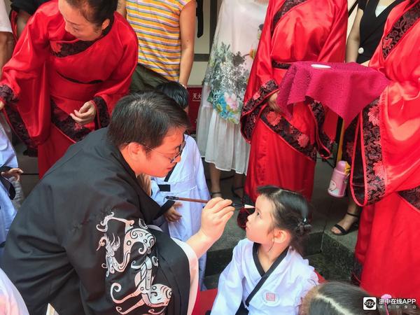 启蒙老师手持毛笔印朱砂,赐学子“智慧”于眉间,寓意学生从此眼明心明,热爱读书。