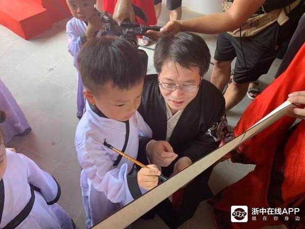 由启蒙老师示范,学童们在家长的帮助下提笔写下一个“人”字。寓意“一撇一捺写成人,一生一世学做人”。