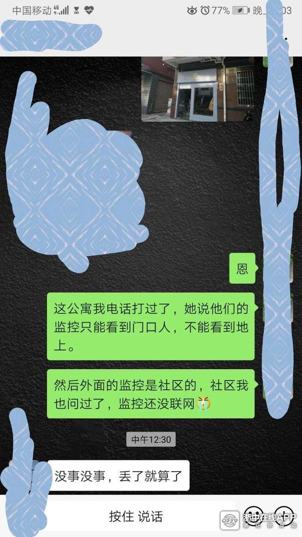 四步,前往牛杂店寻找,牛杂面店说没有看到,因为我昨天走的时候就已经问过,他们晚上也特意帮我留意。确定没有丢在面店。那么最后只有在停车下车的时候手机遗落的可能。当时我车子停在一家觅新开的女装店门口的车位上,店家美女还过来问我车子停到明天什么时候,我说不用明天,等下吃完面就走。可是现在,早上9点30,店家门口空空,还没开门。门口也没有留电话。我查看了周围有四个监控,就地找人打听这监控哪里可以调取。问了几个人后,终于问到一个知道的本地人。他告知,角上的两个监控是社区装的,但是现在还没有联网,不能查看。中间的两个监控是房东自己装的,要问房东。于是我用备用机拍下了水晶公寓的照片,以及这四个监控的照片。