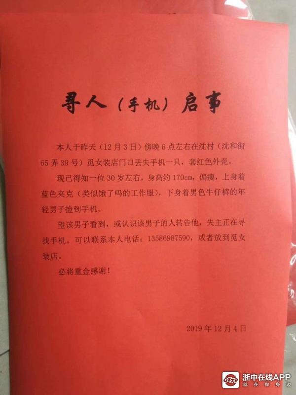 第八步,终于有了线索。下午2点左右,一个陌生电话打进来,是觅女装店家,她告诉我昨天晚上6点左右,天已经很黑了,的确有一个男的捡到一个红色的手机,问她是不是她们的,她说没有,他就走了。接到这个电话,心情非常开心,总算功夫不负有心人,已经有线索了。这时,我想,既然是一个正直的人,捡到手机还会主动问别人的,肯定走的是直路,已经知道时间,监控可以扩散到附件的其他。我把这条线索告诉了老公,老公提醒我可以贴个告示什么的,于是我又电话打到觅女装店,说我准备写个寻人(手机)启示,到时在她家店门口也贴一张,店家很热情,告知了我这个人的详细外貌穿着特征,于是我就写了一个寻人(手机)启示,准备下班后在那失落手机点周围张贴。