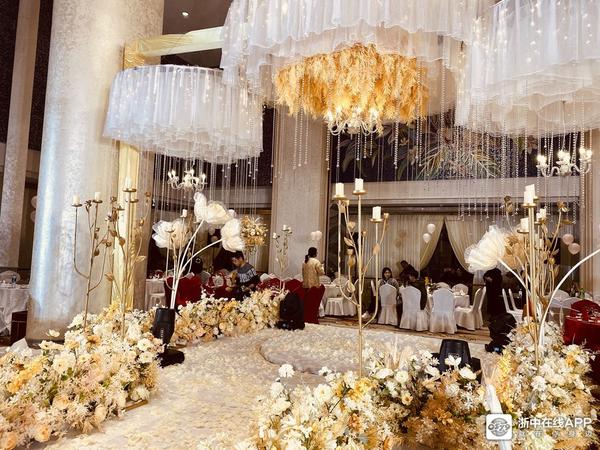 宴会厅整体是暖色调,当天婚礼的布置以香槟色为主和现场环境融为一体,四周香槟色的布幔环绕,增加神秘感~