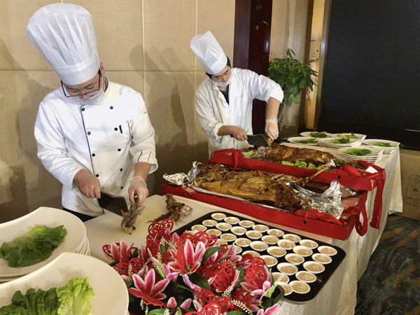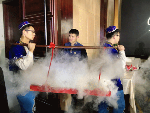 只要你选择的餐标里包含烤全羊,世贸大饭店将会免费附赠一场烤全羊上菜秀。