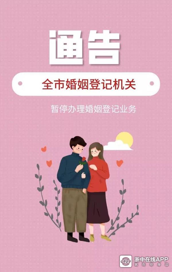 按照《浙江省民政厅办公室关于进一步做好救助管理、殡葬服务、婚姻登记等服务机构新型冠状病毒感染肺炎疫情防控工作的通知》(浙民办﹝2020﹞事8号)和《金华市新型冠状病毒感染的肺炎疫情防控工作指挥部令》(第六号)精神,经研究决定自2020年2月7日起,全市各婚姻登记机关暂停办理所有婚姻登记业务,同时关闭婚姻登记网上预约,恢复时间根据疫情形势变化另行通知。