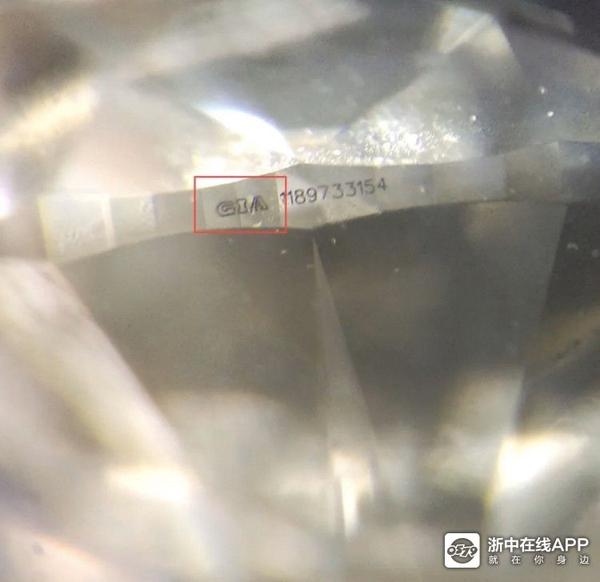 3.CVD套用真GIA证书,这个比较高端,需要通过观察钻石镭射腰码来判定。这个腰楞码是根据GIA证书编号打上去的,目前的作假手段或许还不行。真的腰楞码“GIA’三个字母是空心型数字为单一线条(如图)假的“GIA”字母是实心或者空心做的不够好,有连接!!