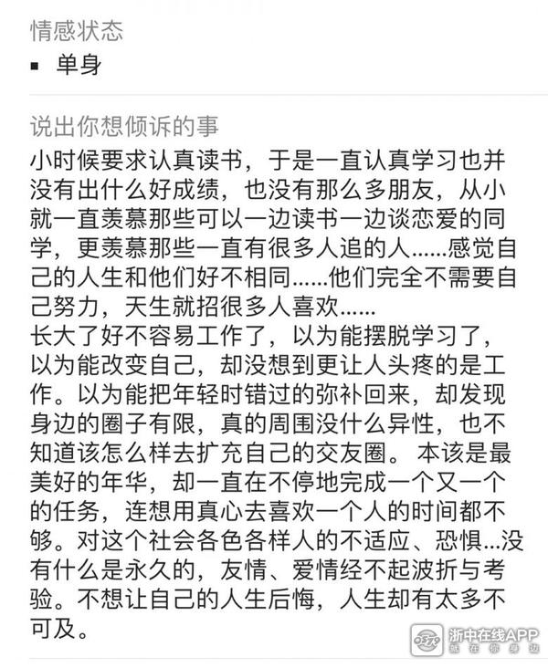 长大了好不容易工作了,以为能摆脱学习了,以为能改变自己,却没想到更让人头疼的是工作。以为能把年轻时错过的弥补回来,却发现身边的圈子有限,真的周围没什么异性,也不知道该怎么样去扩充自己的交友圈。 本该是最美好的年华,却一直在不停地完成一个又一个的任务,连想用真心去喜欢一个人的时间都不够。对这个社会各色各样人的不适应、恐惧…没有什么是永久的,友情、爱情经不起波折与考验。不想让自己的人生后悔,人生却有太多不可及。