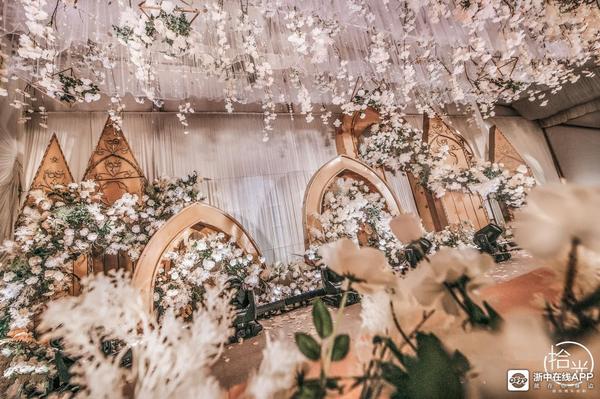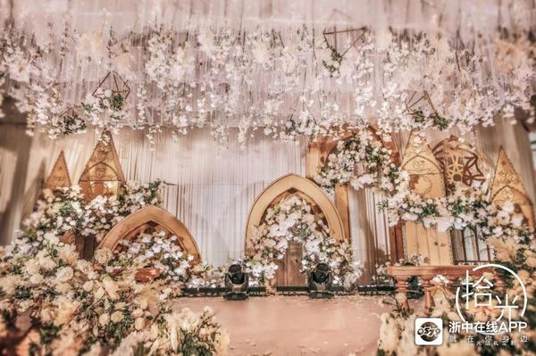 主舞台的背景采用,西式尖肋拱顶的建筑风格,西式尖肋拱顶的建筑风格,在西式文化中是最贴近上帝住所的建筑,更符合西式婚礼中在上帝的见证下结为夫妻。