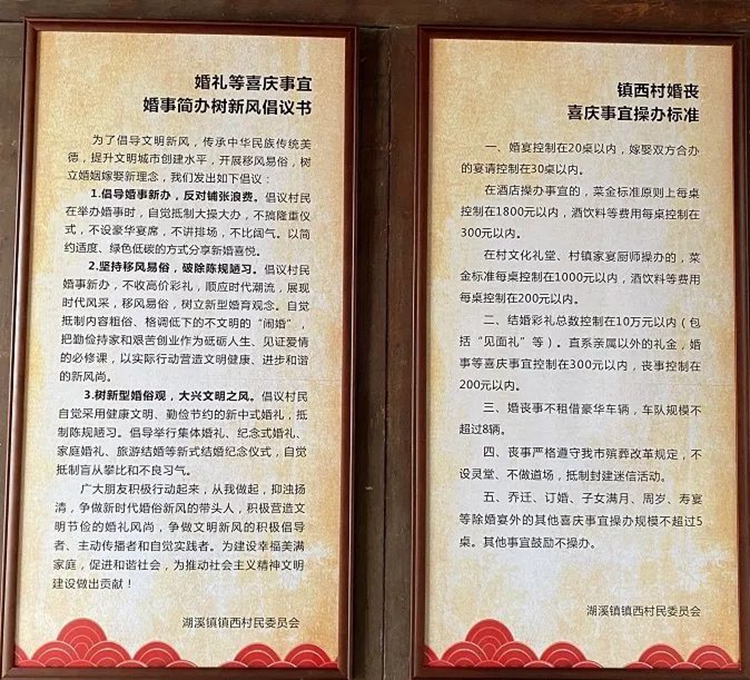 村(社区)推广操办婚丧喜事“流程规约制、标准菜单制、金牌厨师制、礼堂准入制”等管理机制,对推广操办婚丧喜事进行规范化管理。