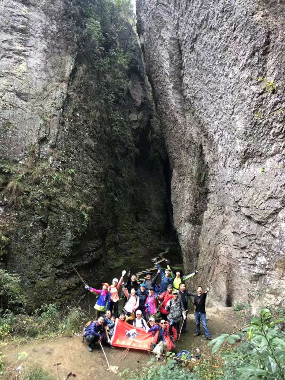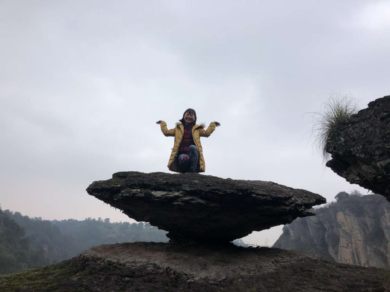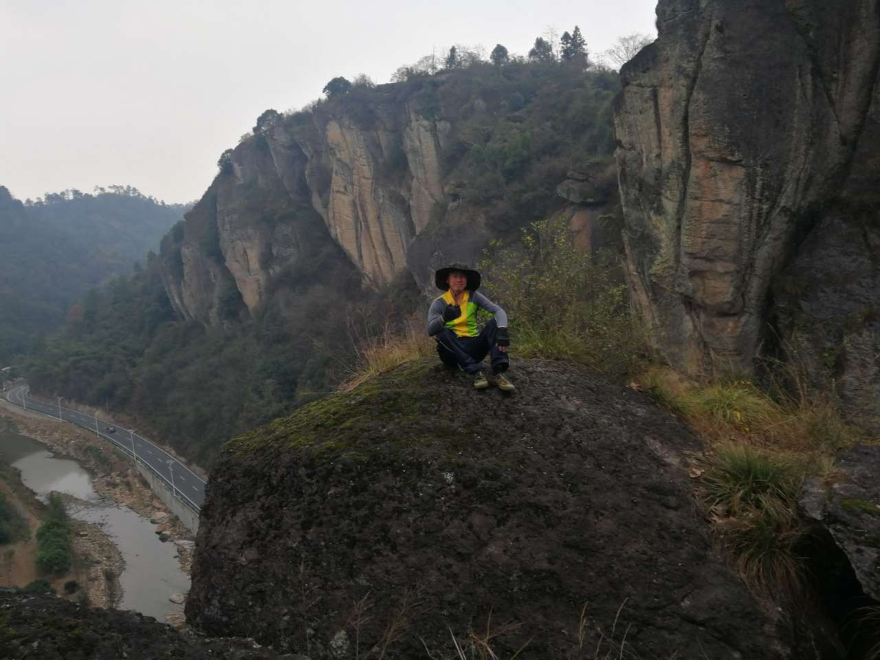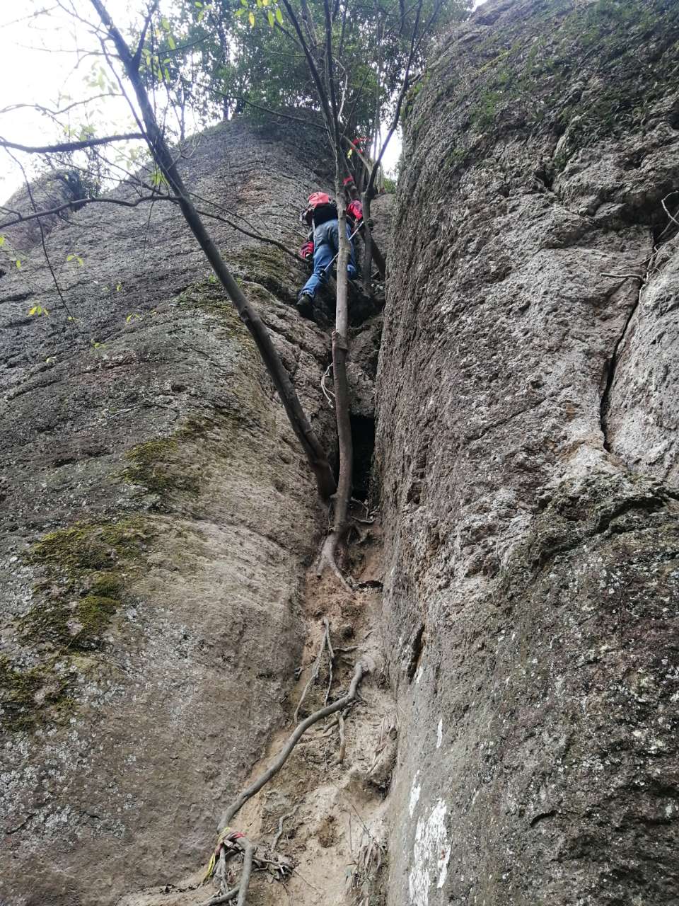 一线天,我们三个趴上面调戏下面花姑娘,一线天顶上的石头居然靠三块石头搭着,看起来特虚弱。我没敢爬上去,空空他们照样上去了