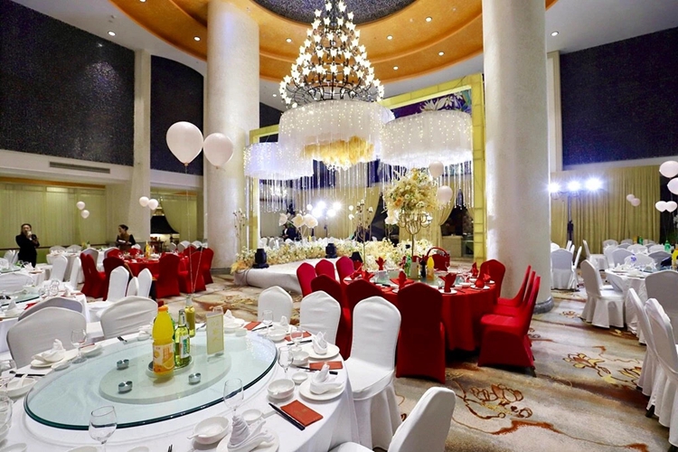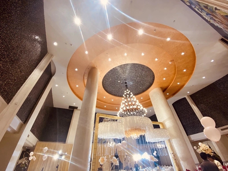 瑞莱克斯大酒店一楼的新宴会厅。这个超大的水晶灯,小喜爱了!整个宴会厅是呈正方形,两边的柱子也丝毫不档视线。