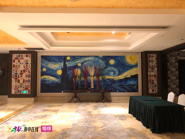 主色调为黄橙白的马赛克瓷砖,梵高的星空壁画,装饰了酒店的同时,也为新人的婚礼提供了更多的主题选择。