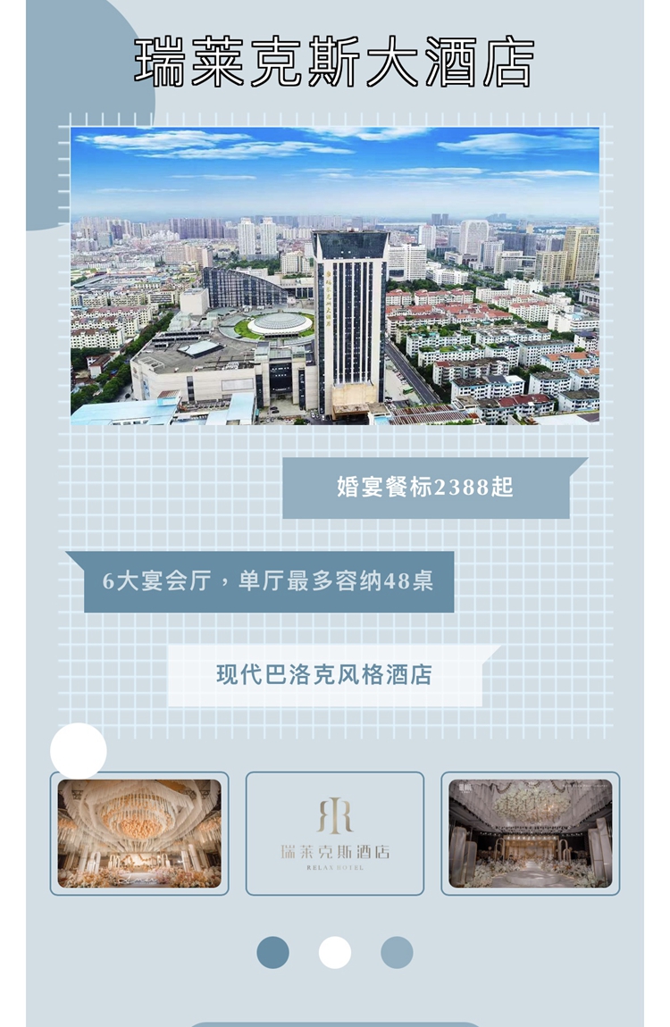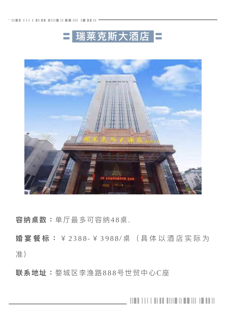 瑞莱克斯大酒店位于金华江南商圈中心,是婚宴、商务、休闲的不二之选。酒店提供会议、客房、餐饮、休闲娱乐的全面配套服务。
