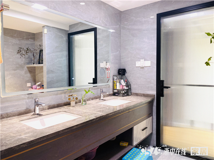 卫生间是定制的台面做了双台盆设计,灰色系的砖配搭黑色外框的长虹玻璃,清爽通透。