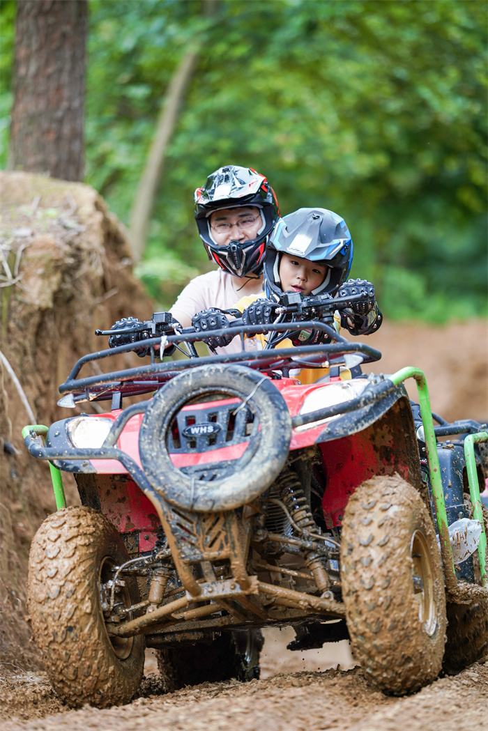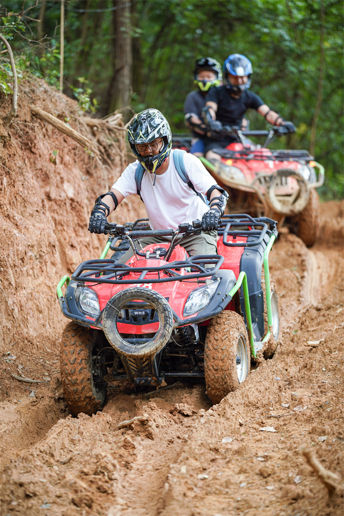 最后我们打卡真正的山地越野!穿上车手服、带上头盔、瞬间觉得浑身开始燥热起来了!油门拧到底!伴随发动机的轰鸣声,沿着山坡一路向上,经历U型弯、过高坡、连S弯路、连坡路、陡坡桥、竹林山地路…真正翻越整座山峰,一次可以开一个多小时!热血澎湃到根本停不下来!