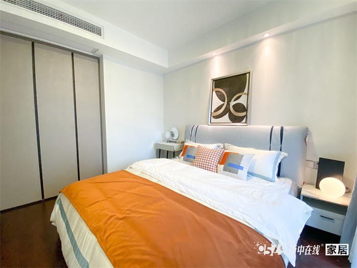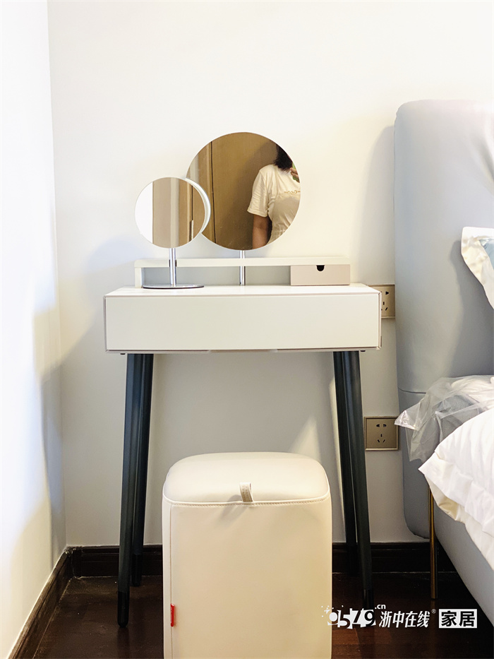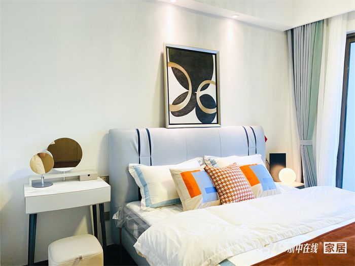 用梳妆台代替了原有传统两个床头柜效果,解决了次卧没有独立卫生间,方便母亲打扮。床头柜和梳妆台采用了柜体同色,和整体空间相协调。