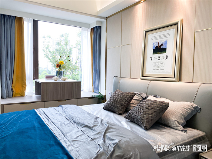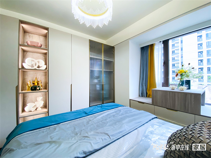 主卧门后做了换季衣物的储物空间,也可放置一些内卫的生活用品和换洗衣物。在床尾做了一排一门到顶的衣柜,满足夫妇俩的生活需求和储物空间。大衣柜加入了部分玻璃门的设计,使整个空间不会显得不会太拥挤,通透性更强。飘窗整体高度不高,增加了单独柜体,做了抽屉,可放置一些文件和小杂物。