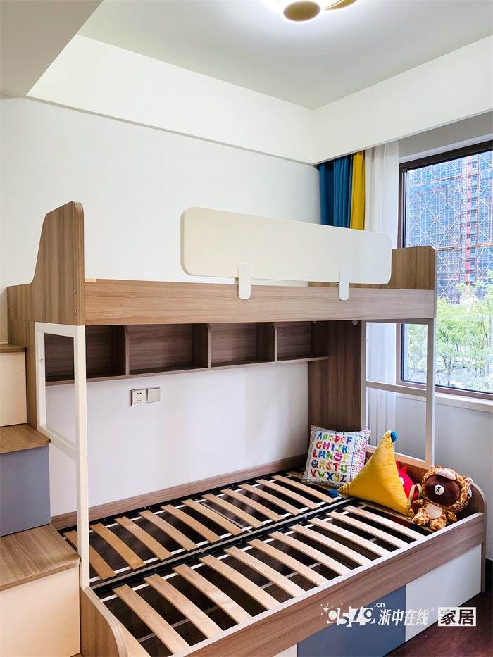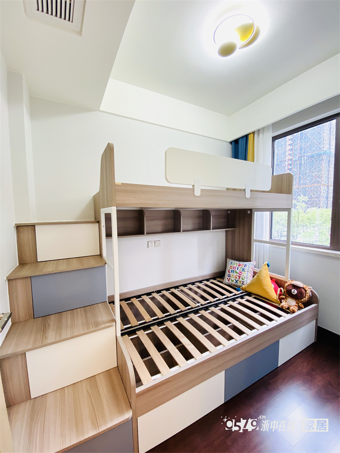 这户业主家是两个小孩,但是人口较多,业主采用了定制上下铺的方式,既合理利用了空间,又将两个小孩的睡眠区域区分开。上下铺下部做了三个抽屉,方便储物。左手边楼梯柜位置采用了抽屉的形式。可放置一些换季的凉席和大件的物品。