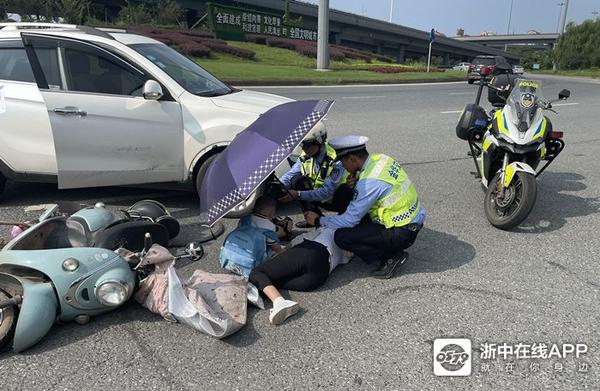 出梅当日,阳光猛烈直射,地面温度高涨,由于受伤女士无法动弹,铁骑队员姜亮找来遮阳伞为母子俩遮挡阳光,而此刻的两位队员却是在高温下暴晒着,他们把伞下的阴凉给了别人,却把毒辣的烈日留给了自己。直至救护车到来,姜亮收起了雨伞帮助医务人员移动伤者,我们这才发现,他撑伞的手臂有着明显的颤抖。