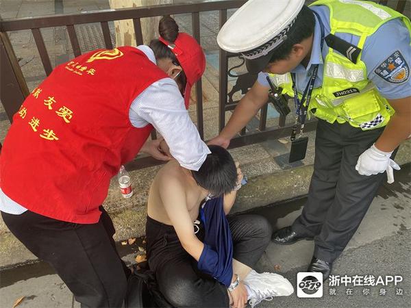 7月20日18时15分左右,八一北街与中山路东北口非机动车道上,一位青年男子靠着护栏蹲坐在路边,身旁停放着一辆共享自行车。正在路口执勤的金华直属三大队江北中队交警王胜发现情况过去查看,该青年男子突然顺着护栏侧滑倒在地上。