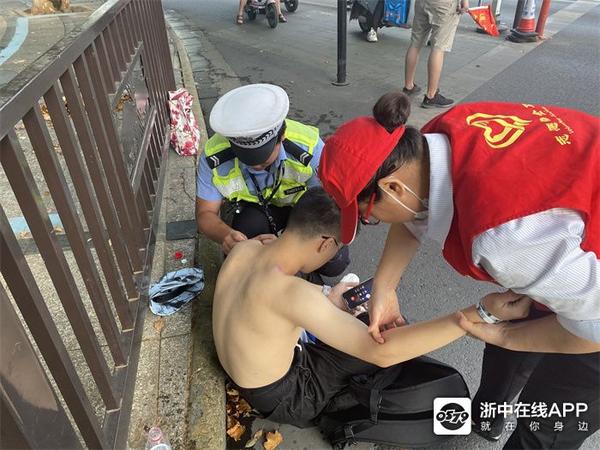 在等待过程中,路口交警联合热心的志愿者们一起,马上对男子进行了散热处理,掀开其上衣保持自然降温,喂他喝水、吃防暑药品;志愿者阿姨用帽子充当扇子给他驱热,适当在其后颈处刮痧疏散湿热。在众人“你一言我一举”的及时帮助下,青年男子逐渐恢复了意识,缓缓说道:“天气太热了,我刚可能骑车太快了,突然没力气,感觉非常难受,现在好多了。”