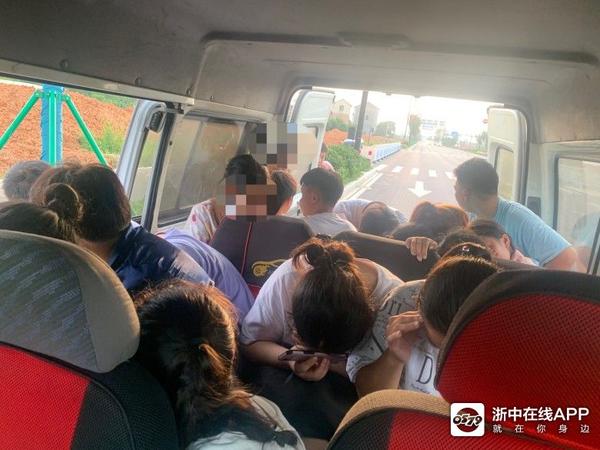 8月1日早晨7时许,金华交警直属三大队白龙桥中队民警李俊青在宾虹西路巡逻。警车行驶至宾虹路雷迪森酒店附近时,李俊青发现边上一辆面包车有些异样,从车窗看进去车内黑压压一片,涉嫌严重超员。李俊青立即示意该车靠边停车接受检查。
