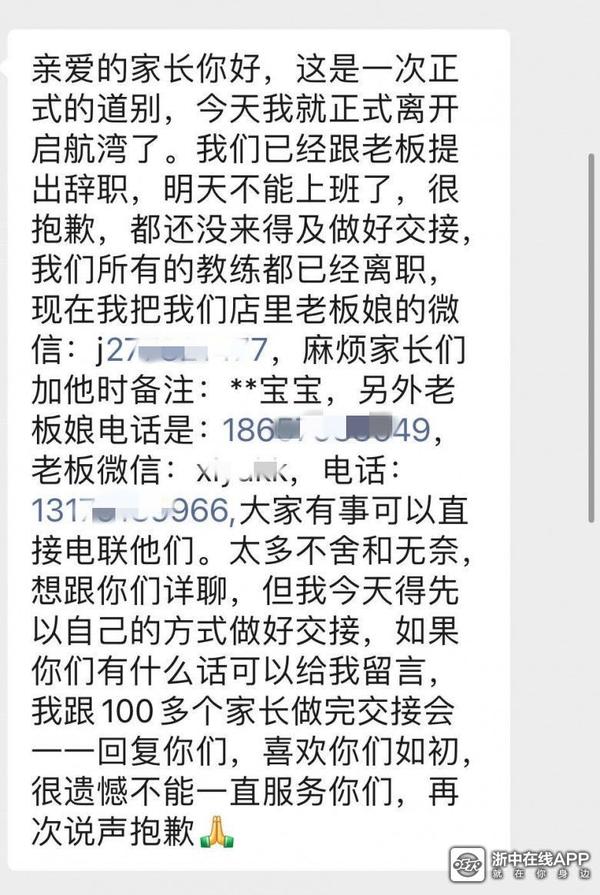 事情经过是这样的,上周末9.5号还有很多家长去上课,机构周一休息,然后9.7日凌晨就有家长收到短信,教练发来的,说他们都集体离职了,短信里还包含了老板和老板娘的联系方式,然后家长就开始慌了,各种联系老板,结果老板一开始还回的,后面一发不可收拾,就什么都不回彻底当乌龟了,第二天很多家长就去店里找老板,结果看到老板在搬东西,这里里面包括了很多学员的资料和合同,被眼尖的家长看到后很多家长都赶去拦截老板和老板娘,结果他们什么话都不说,也不说要继续招人给我们上课,放倒是把这些贵重的东西都拿走了,这是什么意思。。。。事情一出来也不想管了,甚至说要把这个店盘给教练主管了!?关键是教练现在不出来处理一直和老板协商中,协商到人去楼空吗?
