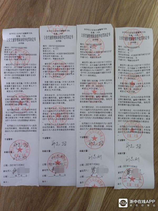 11月3日,金华交警直属二大队打击队民警郑志超接到热心群众举报称,金东区艾青路路段有不止一辆电动车接连闯红灯。随后,郑志超立即开展调查,虽然两辆电动自行车的号牌在监控视频内均无法看清,但通过视频研判追踪后,隔天在某小区找到了这两位正在做装修工作的电动车驾驶员。在民警的询问下,电动车驾驶员对自己的违法行为供认不讳,遂被通知当天到交警队接受处罚。