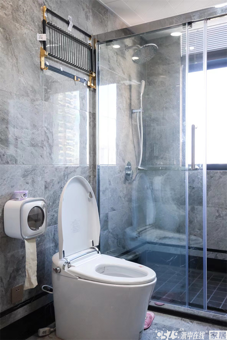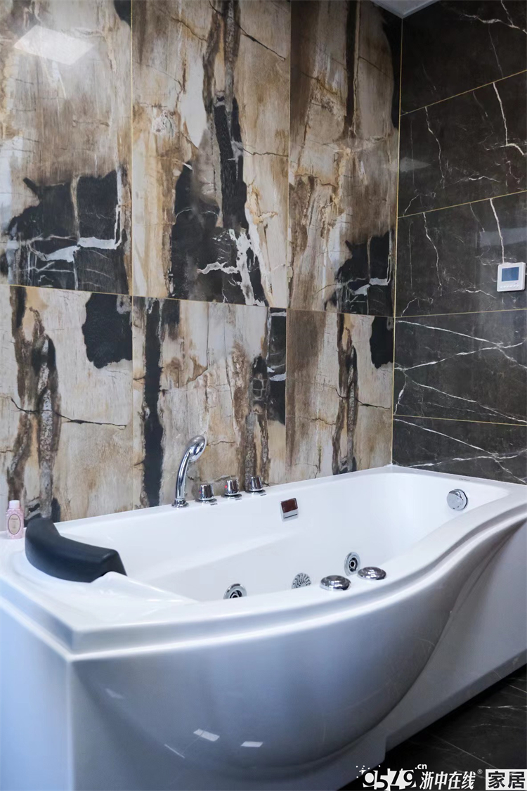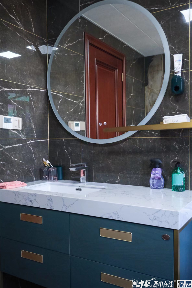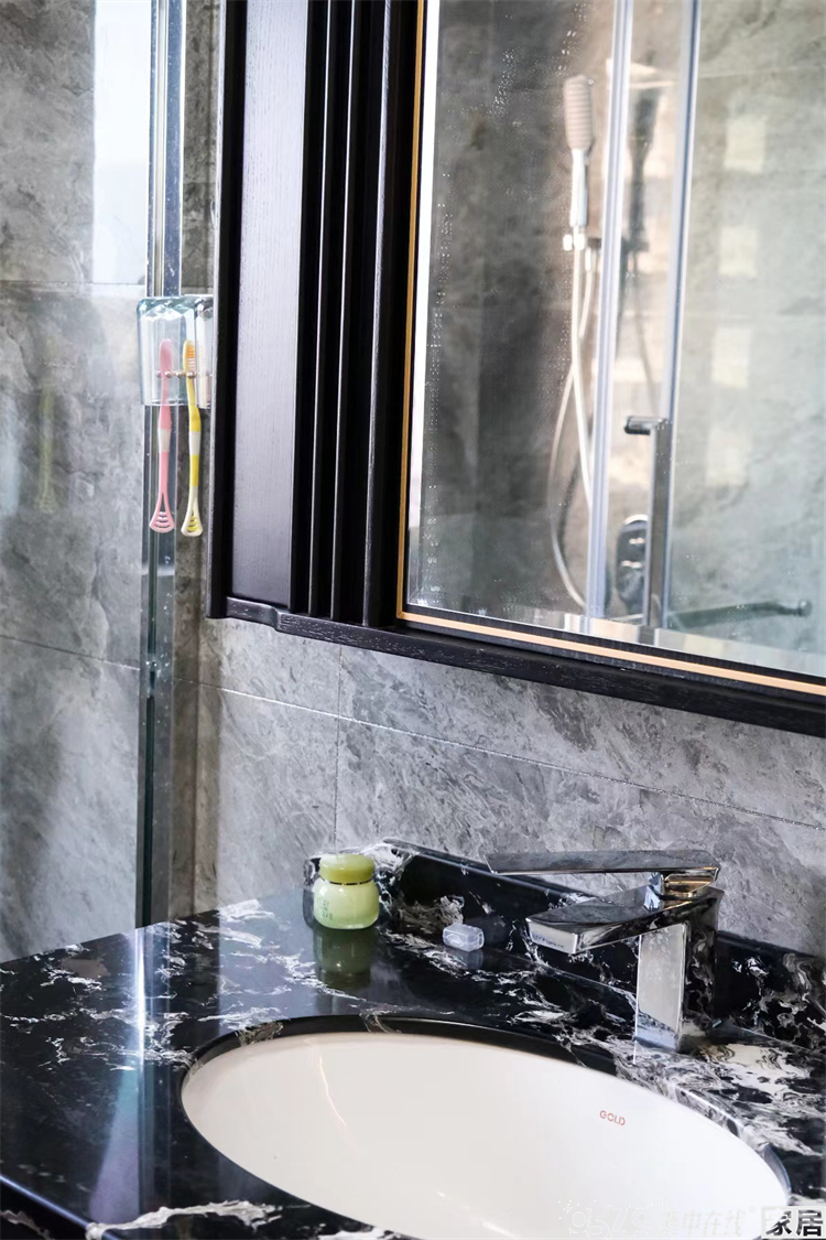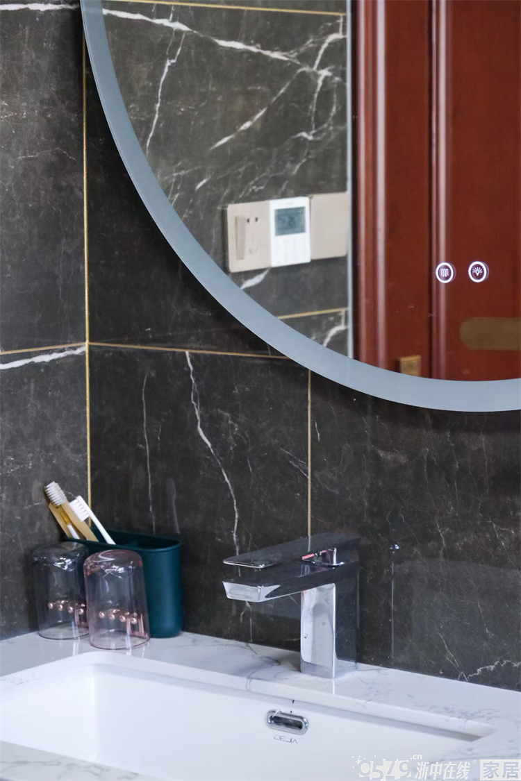 • 内卫瓷砖的颜色搭配非常大胆,黑色系亮面砖配上金色的美缝也是毫无违和感。最喜欢圆形智能镜,颜值绝绝子。