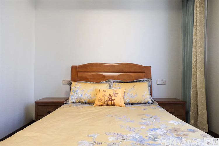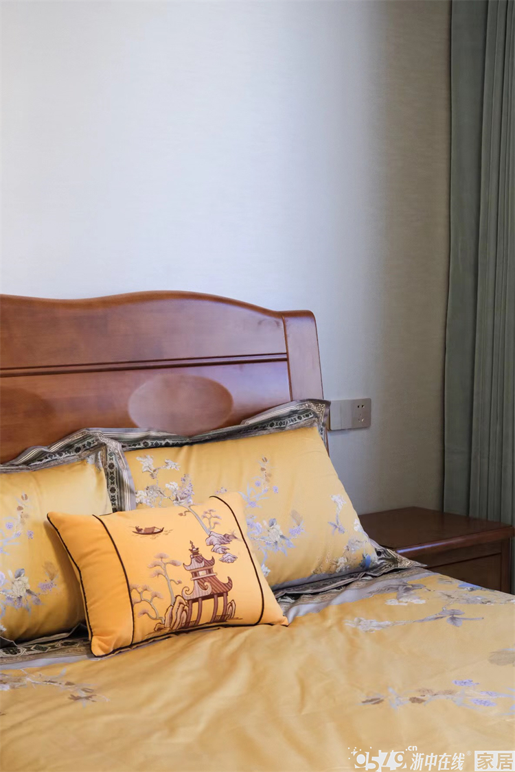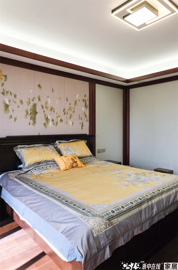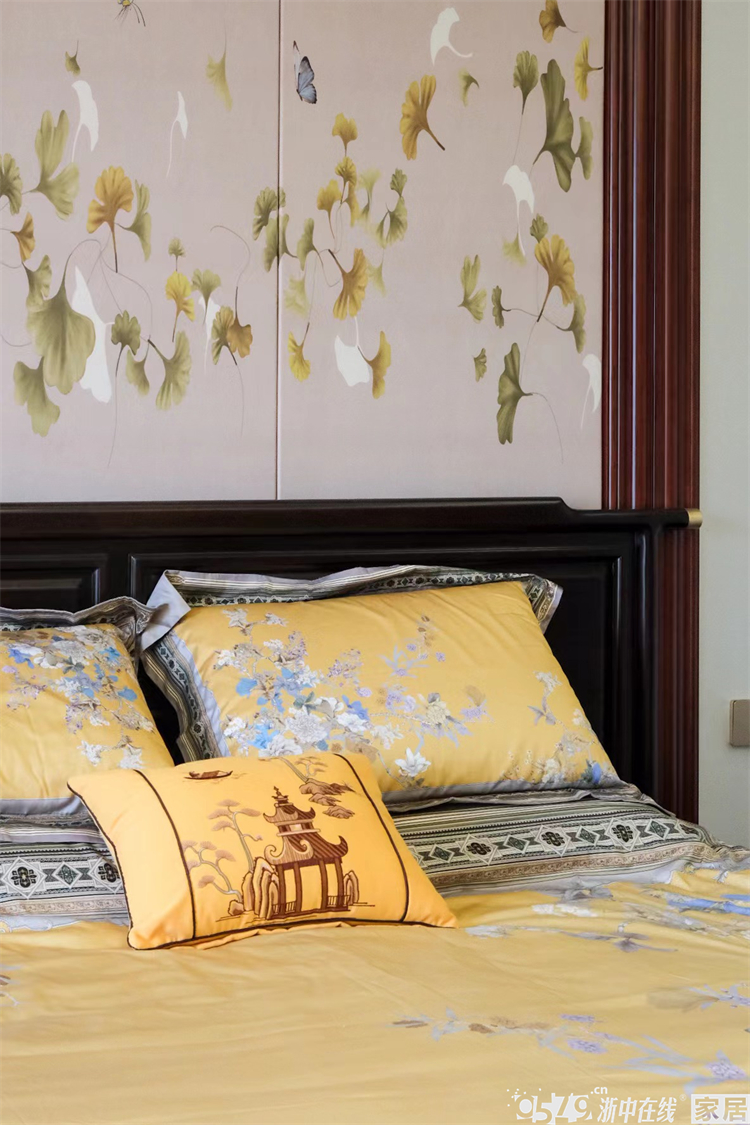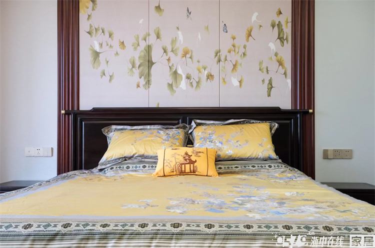 • 主卧背景跟床品搭配非常协调,硬包的银杏图案非常精美,床头背景是左右对称的设计,保留了卧室的大飘窗,下方做了储物柜,整体采光也是超棒的!