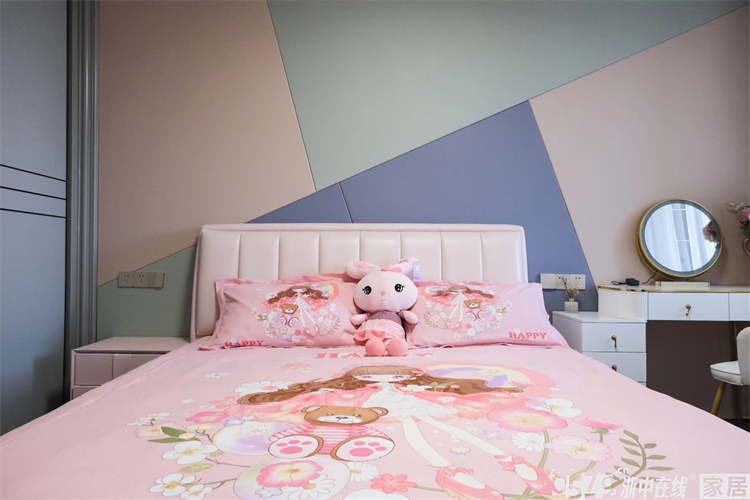 • 儿童房背景用五彩色块的不规则组合增加了活力与生机,白色系的家具非常百搭。