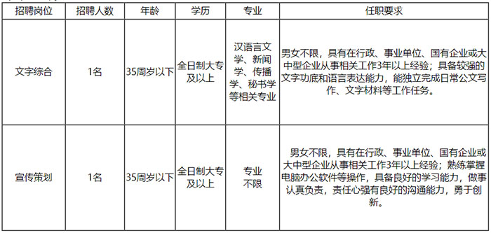 根据公司经营发展需要,决定面向社会公开招聘1名文字综合岗位和1名宣传策划岗位工作人员,具体情况公告如下: