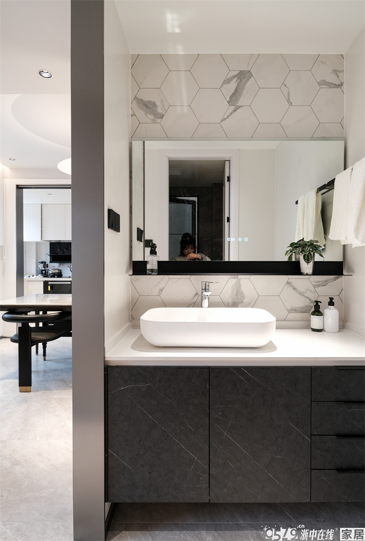 • 玄关背后也是外卫的干区,对外卫起到了遮挡作用呢,干湿分离的设计也更实用。六边形的花砖起到了点缀的作用,想要让卫生间更生动,都可以参考搭配一点花砖哦。
