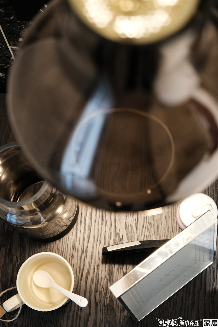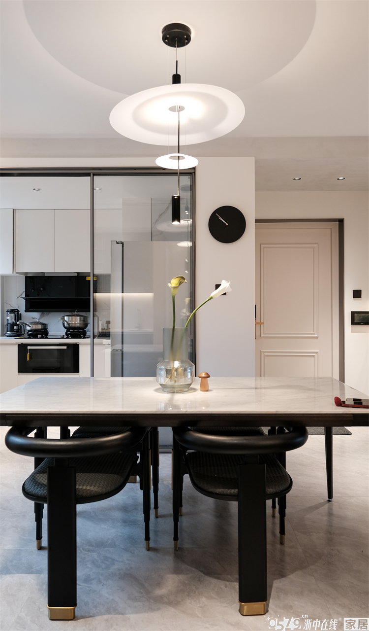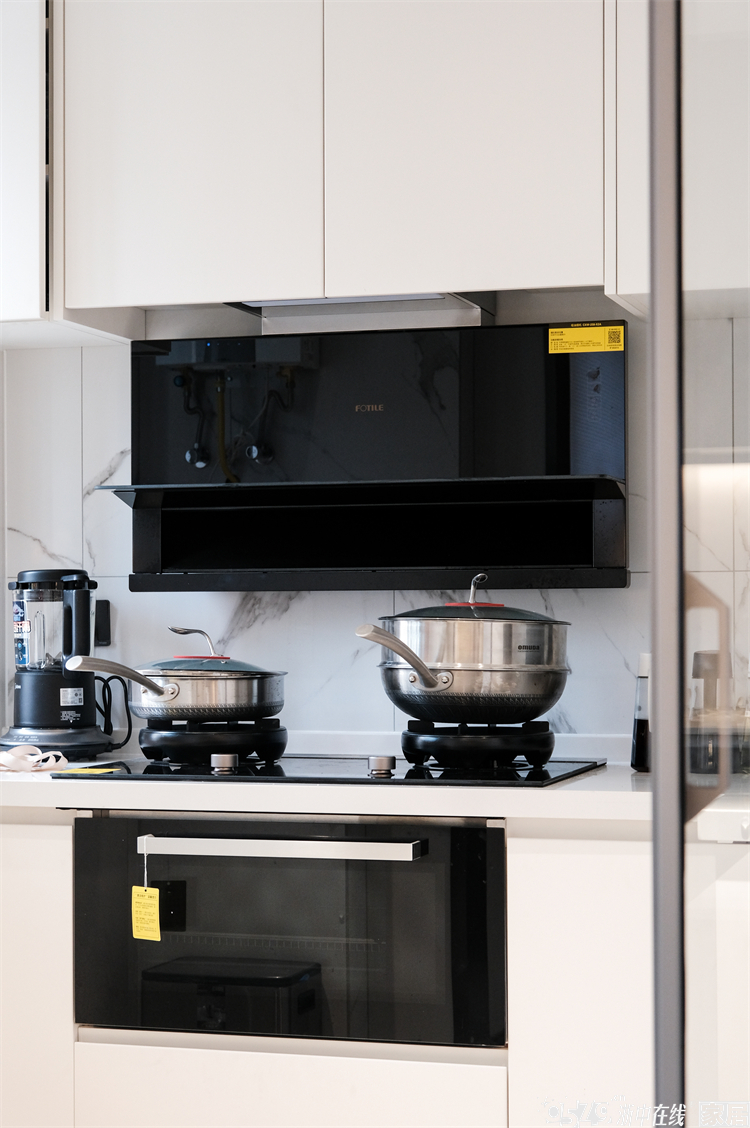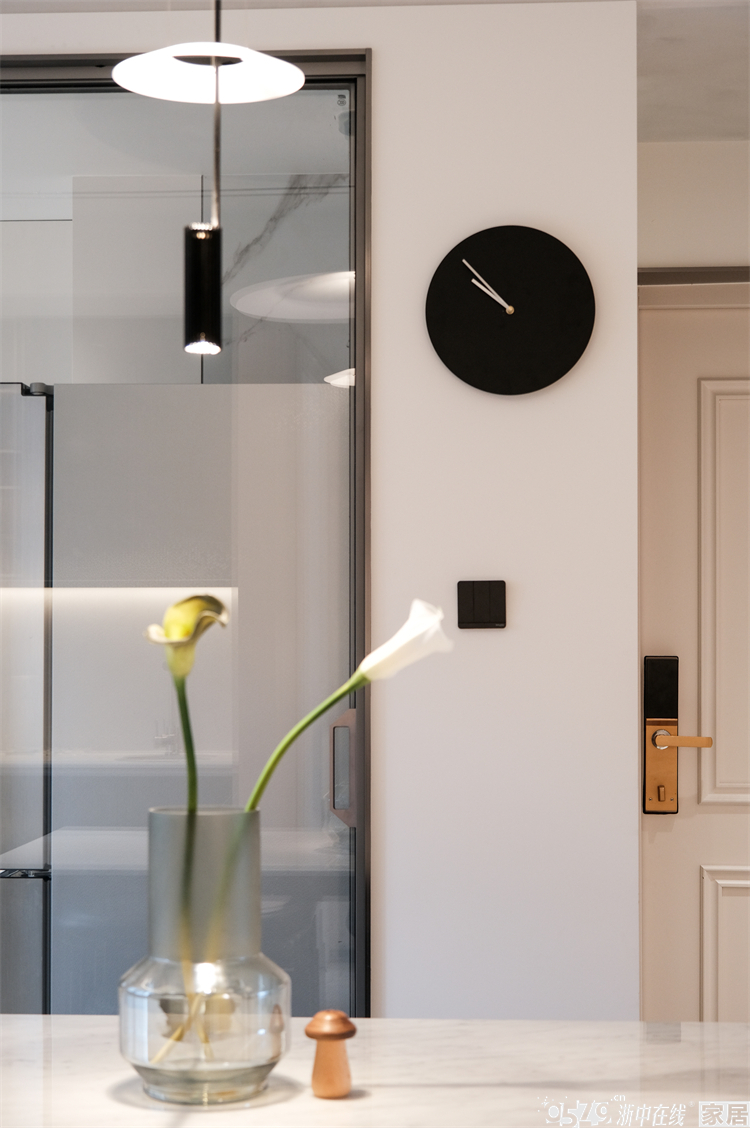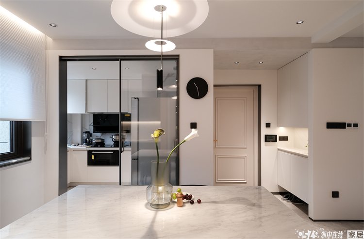 厨房移门不是黑色哑光款而是选了银色边框的,和整个空间的色彩融合更加完美。这样的窄边玻璃移门颜值满分!