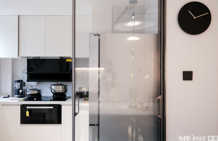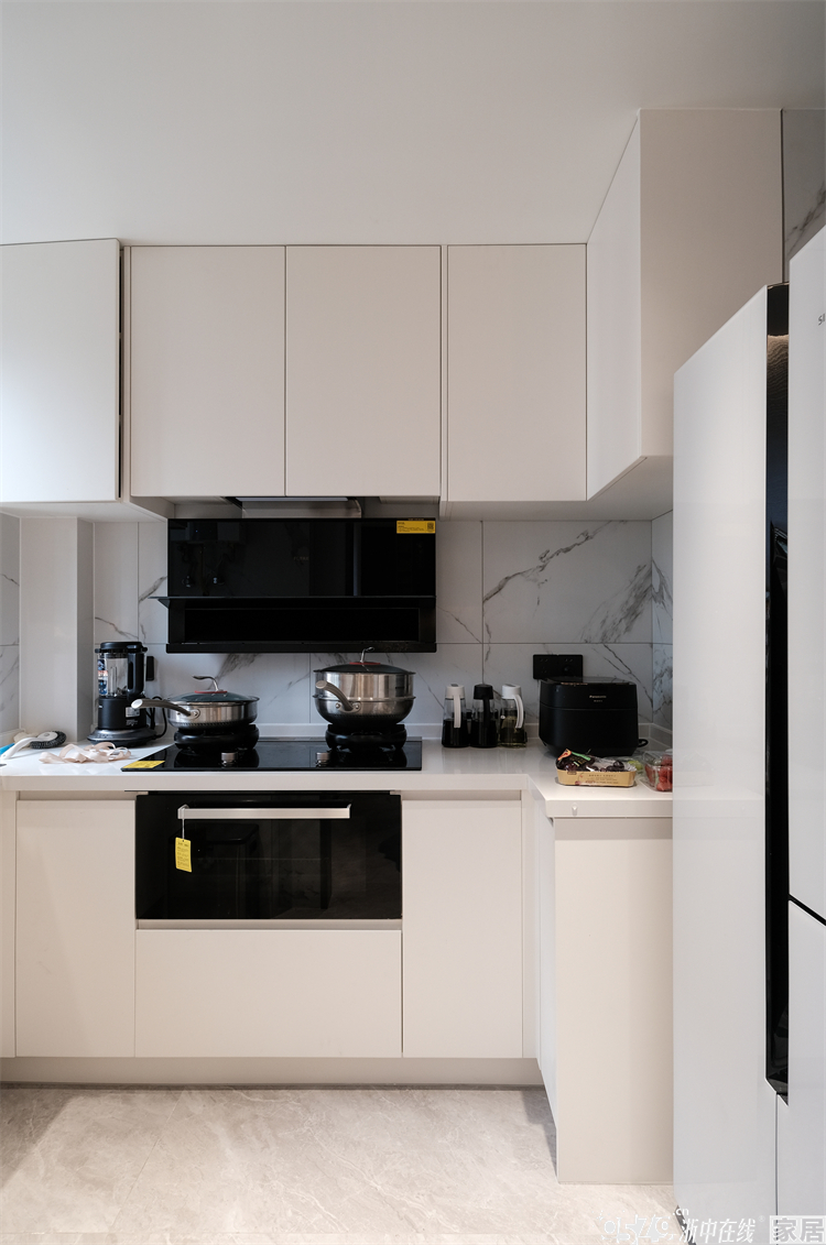 • 厨房同样是白色平板门,厨柜、台面都是白色主调,就连冰箱也是纯白,把简约气质发挥到了极致。墙砖选择了黑白纹路的造型则刚好起到了衬托的作用。