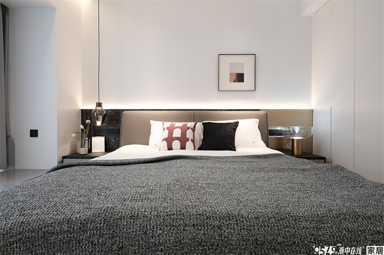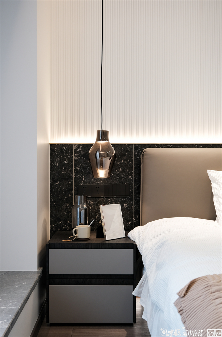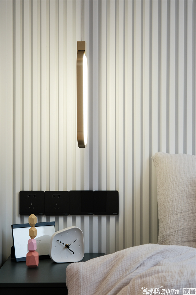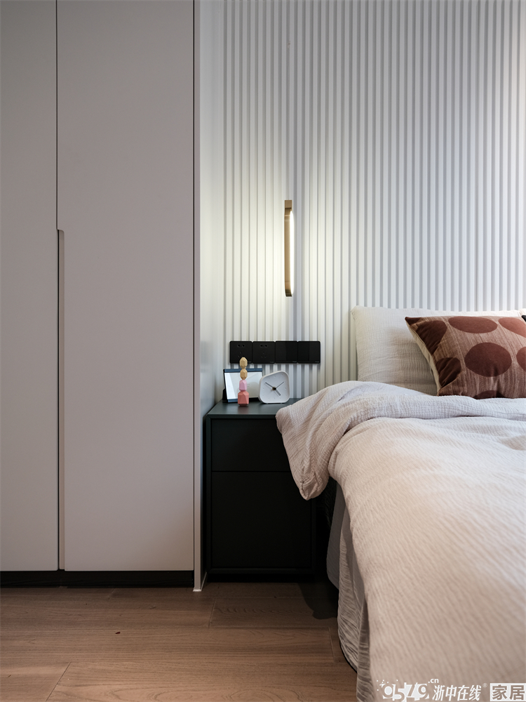 主卧还原度也很高,背景是波浪板和黑色瓷砖的拼接,搭配金属卡条和灯带,层次感很强!波浪板是木格栅的一种,也是实木材质的,整个家各个区域的背景都有木格栅的元素,但都采用了不同的款式,通过不同色彩去组合搭配出不一样的感觉。