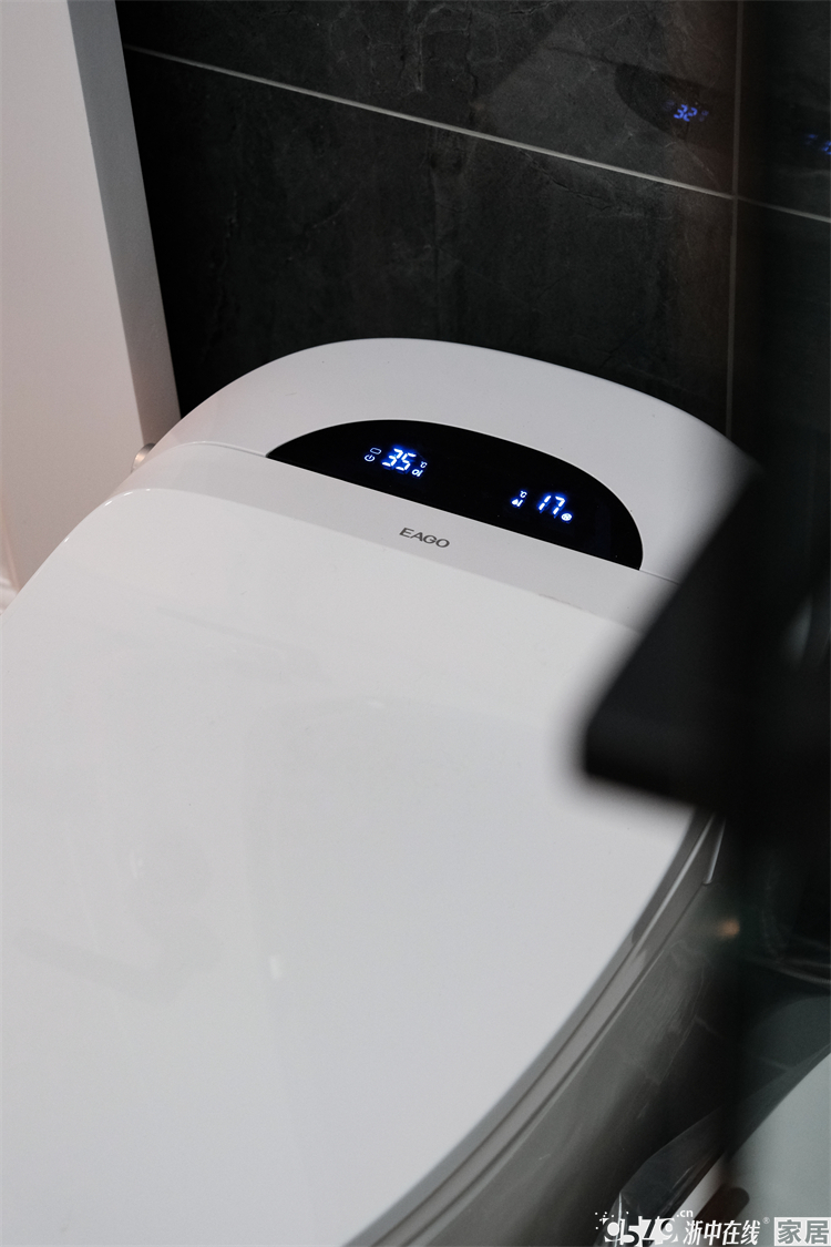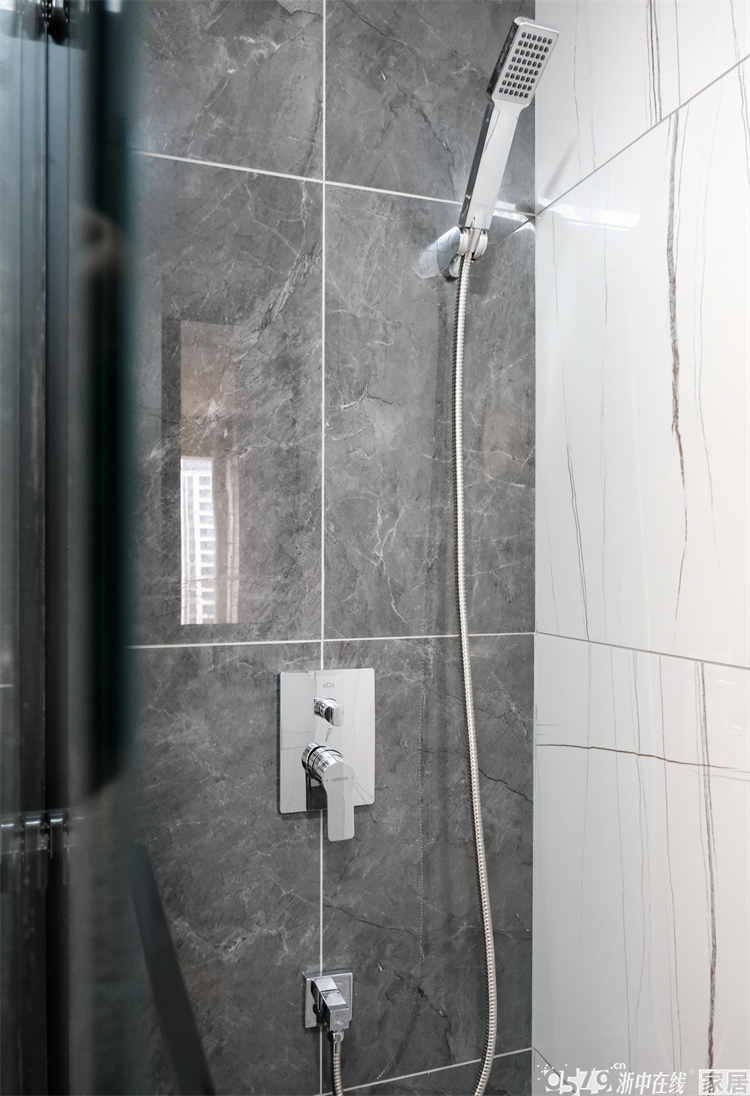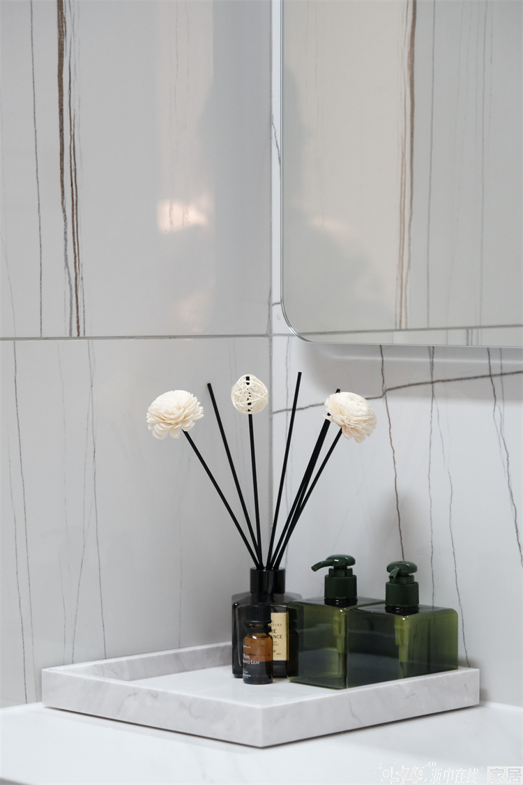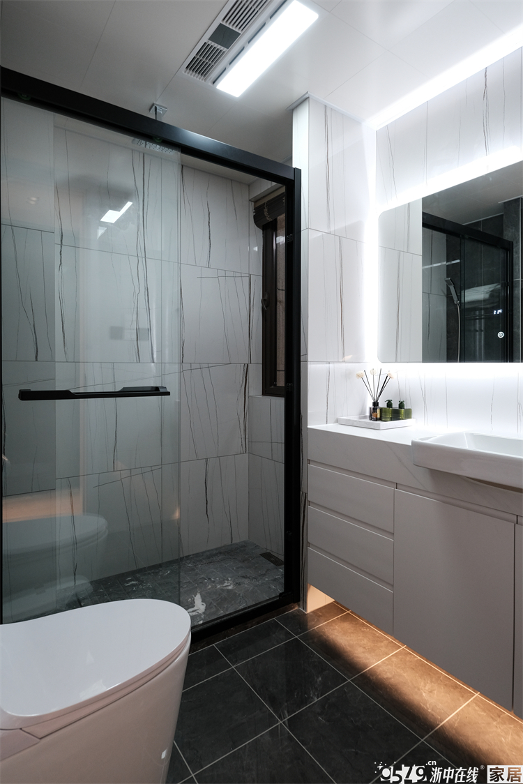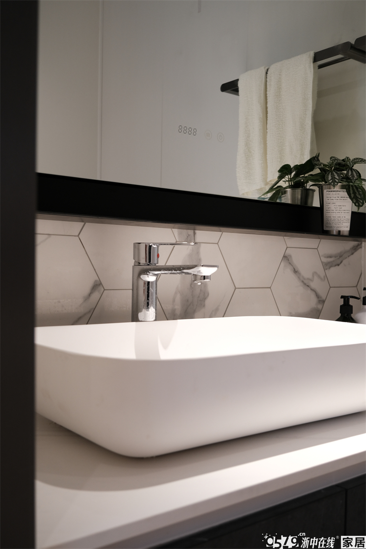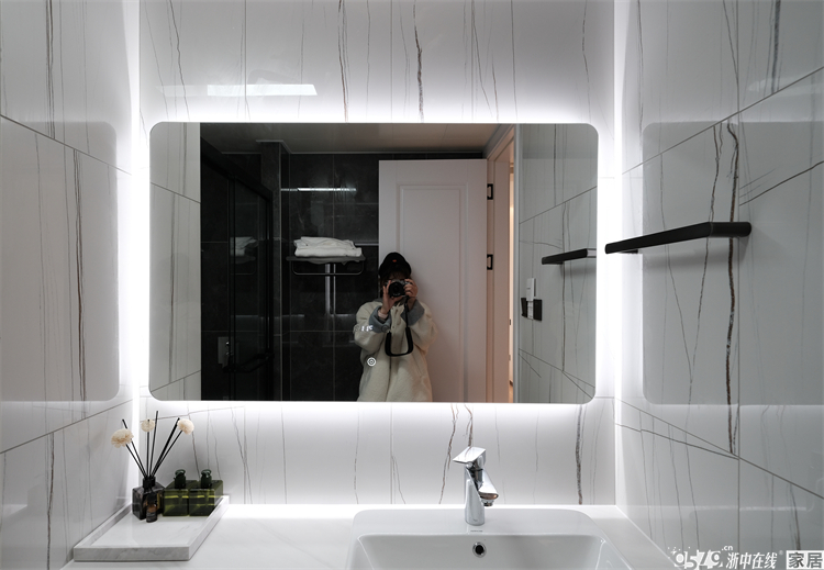 内卫是正方形的区域,不大的空间功能性齐全,定制的洗手台盆尺寸完美贴合,台面上不乏置物空间,智能镜也是绝绝子,墙面的竖条纹瓷砖和白色卫浴形成视觉交叉,不规则但很有序。